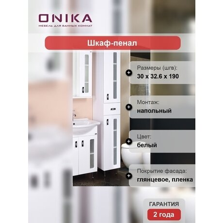 МодернШкаф-пенал прямой, белый глянец, МДФ и ЛДСП, с дверками и ящиками, 32×33×190 см